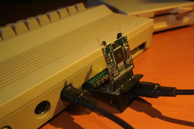 It has to plug into the back of the Commodore, presumably for power, and then the drive cable goes into it as well. Then, it is ready to act exactly like a floppy drive.