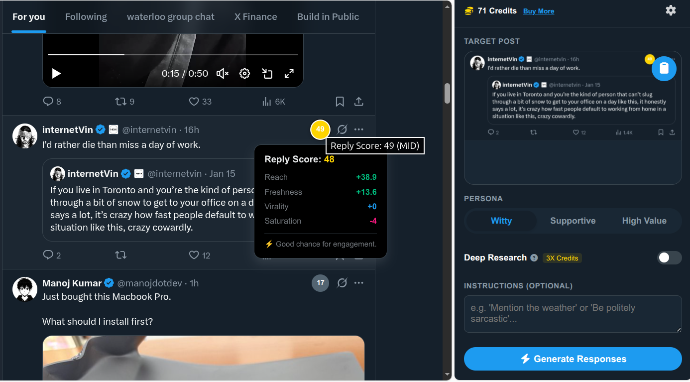 I built a scoring engine into the extension that acts as a client-side ranking model. It analyzes the "Viral Potential" of a tweet before I even write a word, looking for high-authority accounts posting fresh content that hasn't been saturated by hundreds of replies yet.